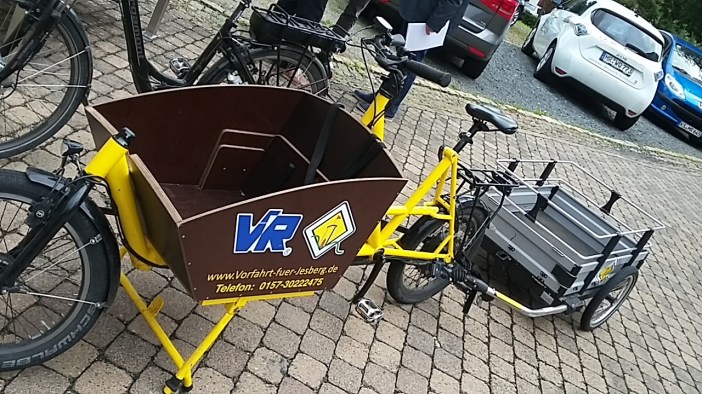 VoJes – „Vorfahrt für Jesberg e.V. „, die mich zu diesem Tag eingeladen hatten. In diesem Dorf wurde echt schon viel auf die Beine gestellt. Das ist auch bitter nötig, denn mit dem ÖPNV sieht es traurig aus, wie ich selbst erleben konnte. Es gibt zum einen ein Carsharing-Angebot, aber auch Bikesharing mit Pedelecs und e-Cargobikes, dazu noch Mitfahrbänke. Die e-Lastenräder können ganz normal ausgeliehen werden. Möglich ist auch ein Bringservice in Zusammenarbeit mit dem örtlichen Einkaufsmarkt. Laub oder Grasschnitt wird über den Abholservice zum Bauhof gefahren. Mit diesen Fahrten wird ein Geflüchteter ins Dorfleben integriert. Viele verschiedene Institutionen und Personen haben sich hier vernetzt, um ein gemeinschaftliches Projekt auf die Beine zu stellen. Der Vorsitzende des Vereines, Michael Schramek, ist vom Fach und kümmert sich auch hauptberuflich um Mobilitätsberatung.