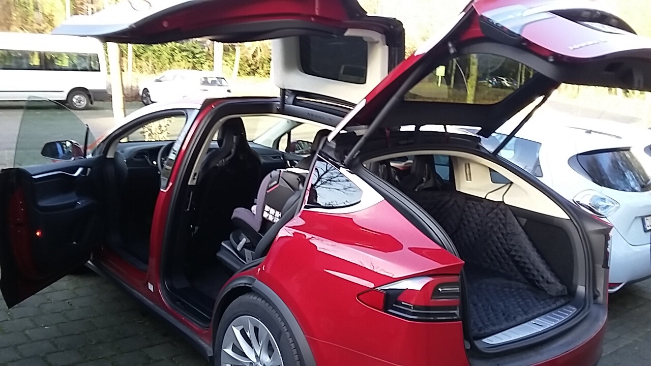 Nach einem kleinen Imbiss zeigten die eMobilisten ihre Wagen. So viele verschiedene Marken und Modelle auf einmal hatte ich bisher noch nicht erlebt: BMW i3, mehrere Renault Zoe, Hyundai ioniq , Opel Ampera, Nissan E-NV, natürlich VW eGolf und eUp – und ein Tesla Model X. Der hat mir ganz schön den Kopf verdreht! In Hamburg hatte ich schon durchs Schaufenster des Tesla-Store gelinst. Aber hier konnte ich in Natura Platz nehmen. Wenn da nicht das Problem des notwendigen Kleingelds wäre…