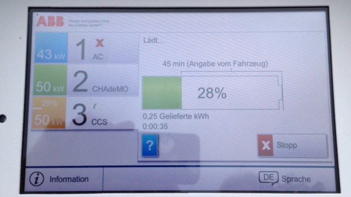 Raststätte Ellwangen an der Jagst erreicht. 16.30 Uhr. Mit 20 km Rest. Puuuh, das Laden klappt ohne Probleme.ABB Säule, Verbund mit EWE Roaming Partner.