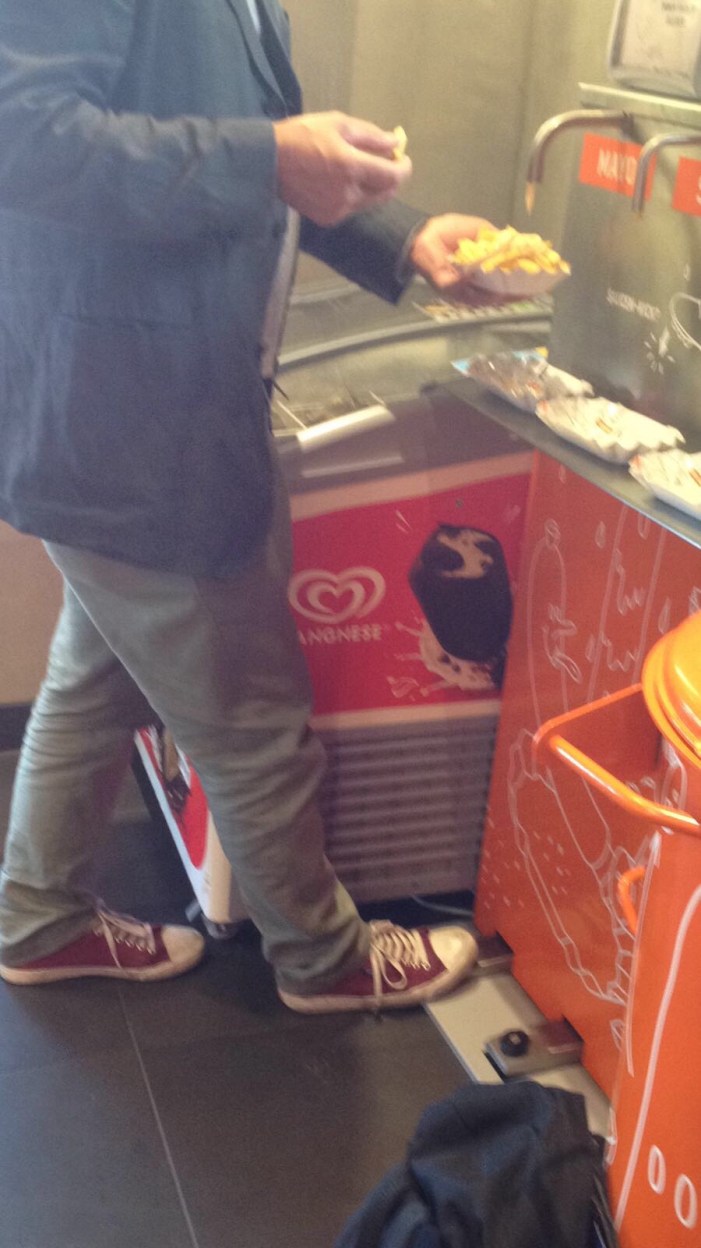 Beim E-Golf mit Strompedal, im Imbiss in Ellwangen auch per Fusspedal die Mayo-Betätigung für Claus‘ Pommes.