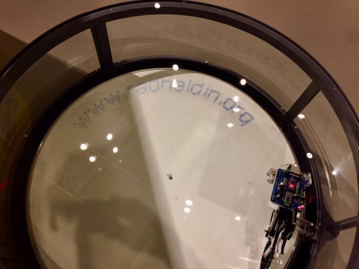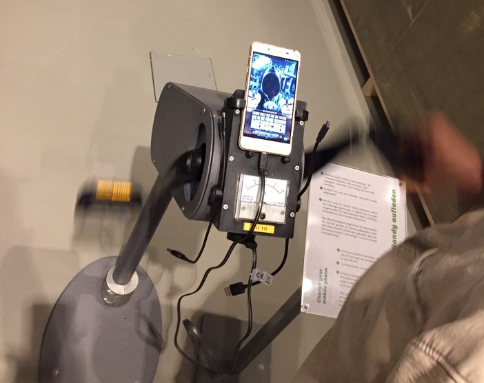 Bei diesem interaktiven Ausstellungsstück kann man eine SMS schicken und der Text wird kurzzeitig durch das Rad ausgedruckt.