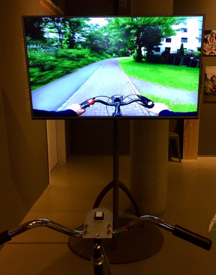 Die Fahrradwege in Bremen kennen sicherlich die meisten Ausstellungsbesucher. Hier kann man virtuell in Jerusalem, Ottawa und Neapel fahren. Leider gibt es keinen Vorlauf des Videos, mit dem man zwischen den Städten umswitchen kann.