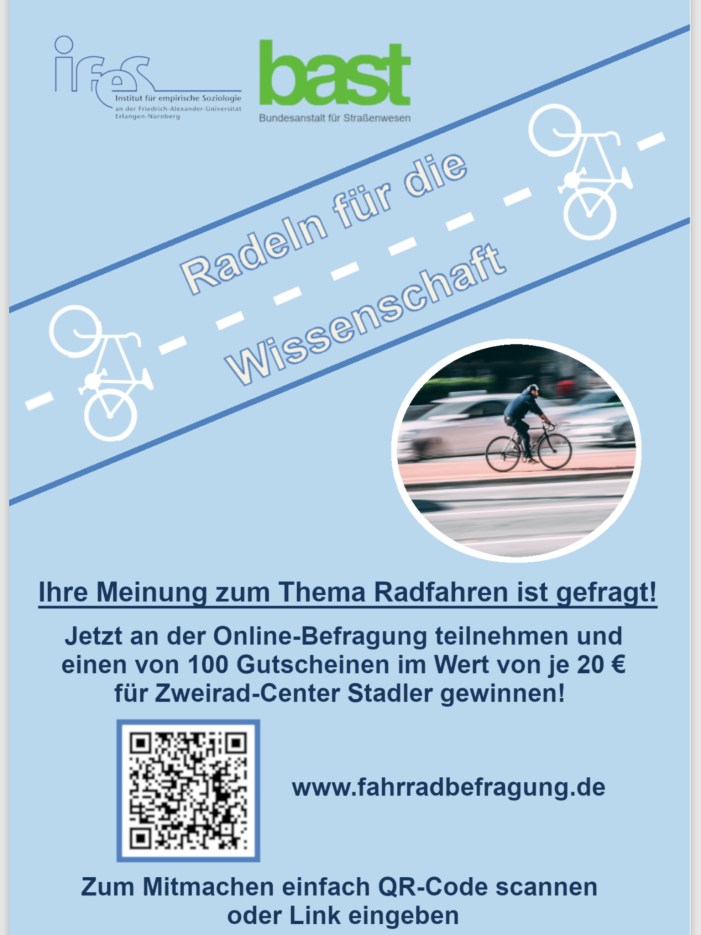 Zu diesem Thema gibt es eine Umfrage, die vom Institut für empirische Soziologie (IfeS) an der Friedrich-Alexander-Universität Erlangen-Nürnberg im Auftrag der Bundesanstalt für Straßenwesen – einer nachgeordneten Behörde des Bundesverkehrsministeriums (BMVI) – durchgeführt wird. Die Teilnahme dauert ca. 10 min. und lässt einen durchaus über die eigene Smartphonenutzung nachdenken. Es gibt eine Verlosung, wenn man seine E-Mail-Adresse angibt, aber man kann auch anonym teilnehmen. http://www.fahrradbefragung.de/