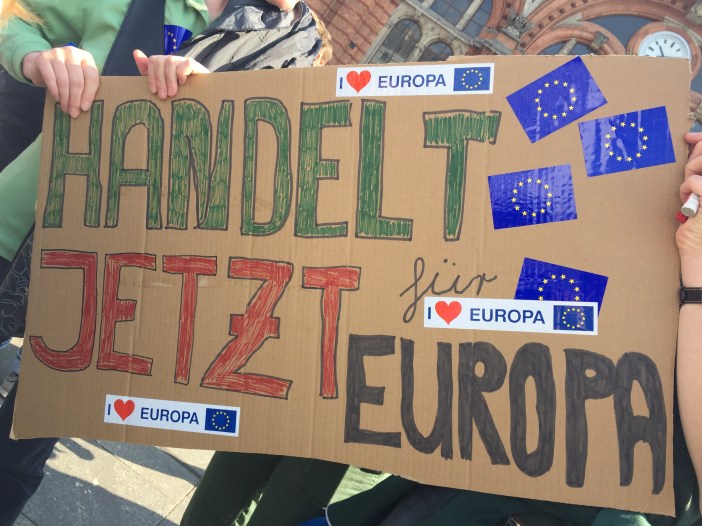 Der Termin anlässlich der an diesem Wochenende stattfindenden Europawahl ruft eindringlich dazu auf, das Wahlrecht auszuüben. Ein Großteil der Demonstranten kann dieses leider noch nicht. Umso wichtiger ist es, dass alle anderen es tun!