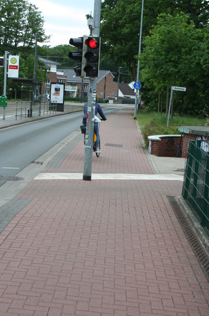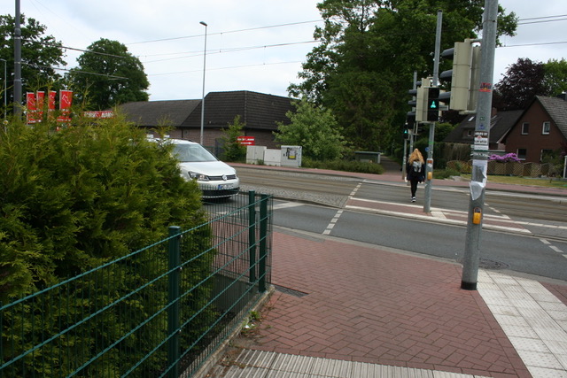 Zuletzt kam es im Mai zu einem Unfall an der Überquerung der Falkenberger Landstraße, Höhe Heckenweg / Timkenweg. Aus dem Heckenweg kommend, zeigt sich die folgende Situation: Die Ampel zeigt grün für Fußgänger und Radfahrer. Die Autos halten. Nach links ist die Falkenberger Landstraße durch eine Hecke verdeckt und nicht einsehbar. Wenn ein schneller Radfahrer von links kommt, kann es leicht zu einer Kollision kommen.